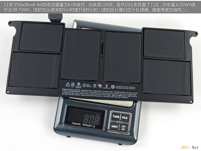 11英寸MacBook Air的电池重量为8.08盎司,也就是229克,比老款重了几克,续航方面由原来的5小时提升至9小时,几乎翻倍。