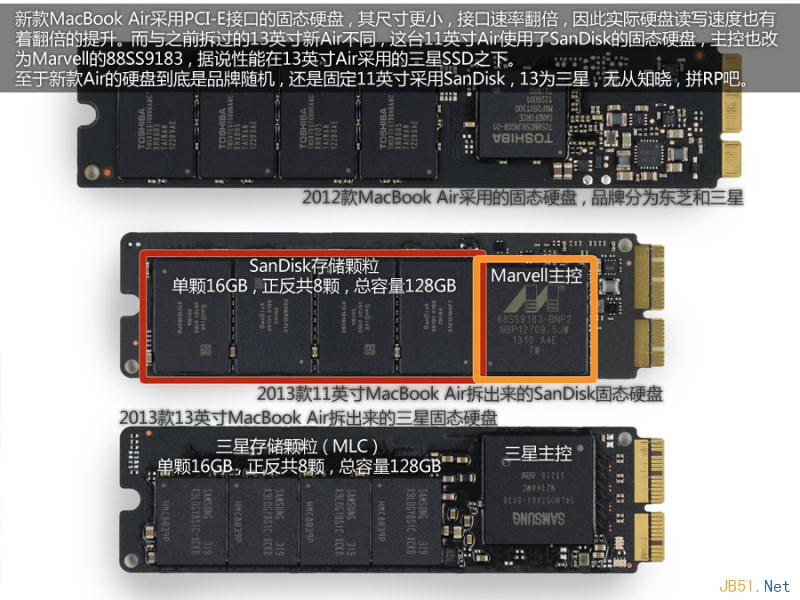 新Air的固态硬盘有两个品牌,主控不一样,缓存容量也不一样,其中SanDisk为256MB。