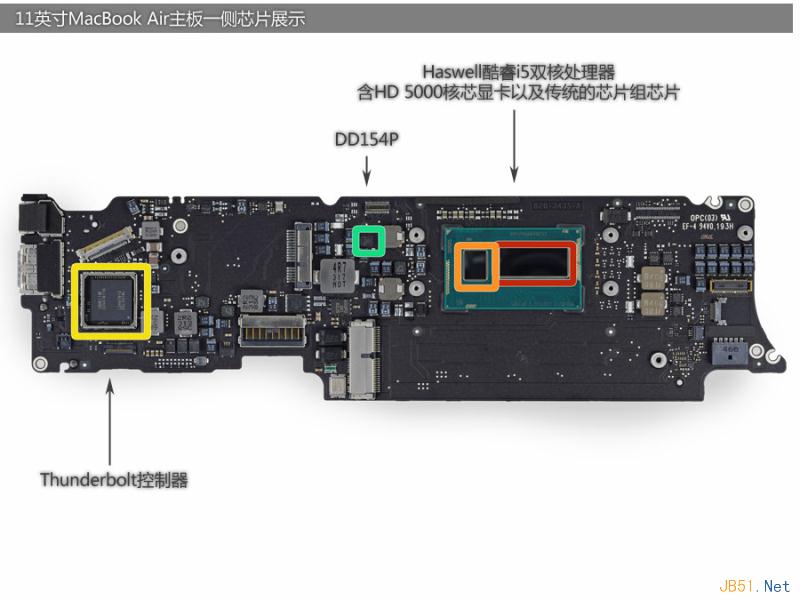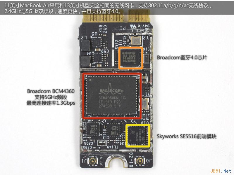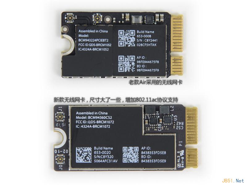 新款MacBook Air采用的无线网卡尺寸比老款大了一些,并增加了802.11ac无线协议支持,带金属屏蔽罩。