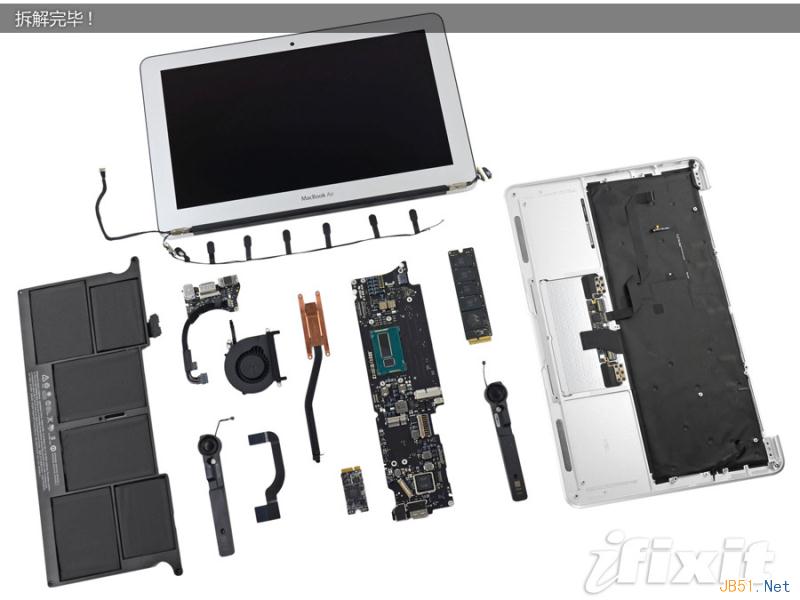 至此这台2013款11英寸MacBook Air拆解完毕。该机主板集成度很高,布局工整,没有太多零零散散的排线,看似简单,但又非常精密,黑色主板也显得很上档次!其升级空间很有限,处理器、内存均不可升级,硬盘目前也不容易找到替代品,因此在购买之时就必须为未来做好打算,购买配置较高的版本。谢谢您的观看。