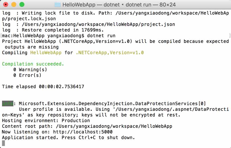 新建了应用程序之后,使用dotnet restore 和 dotnet run 命令来测试一下我们的应用程序。