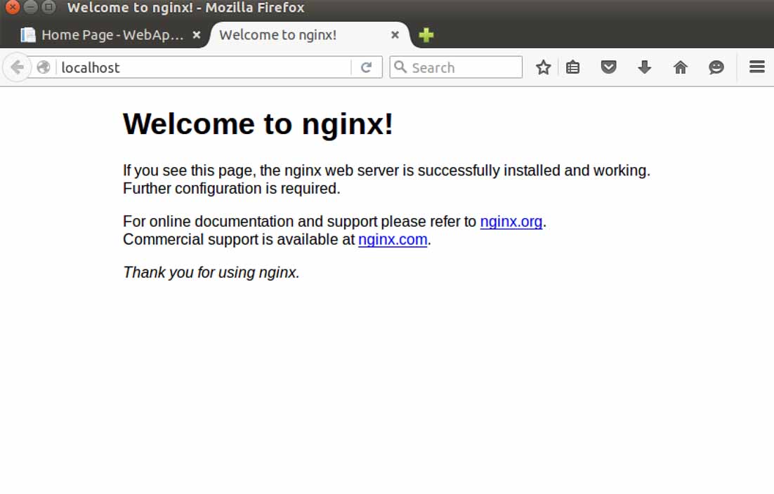 测试 nginx 是否运行成功,打开浏览器,输入 http://localhost 查看是否显示如下界面。