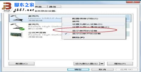(4)在弹出的窗口中查看录音设备中有无Lenovo usb2.0 audio 麦克风,若没有则可以在此窗口空白处右键点击显示禁用设备。