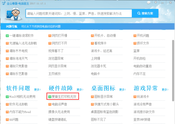(2)选择硬件故障中的“爱普生打印机无效”,电脑医生会根据您的电脑环境帮您快速修复