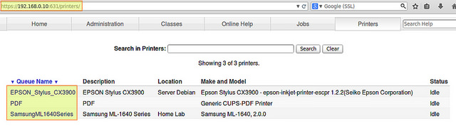 为了验证哪些打印机可以在我们的服务器上适用,我们也可以在服务器上使用lpstat命令,或者浏览网页https://192.168.0.10:631/printers page.