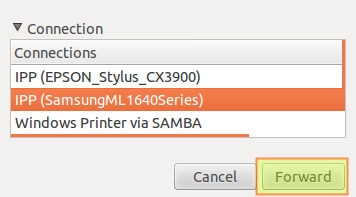 2) 在最下面我们将会看到可使用的打印机的名称。我们来选择这台三星打印机并按"Forward":