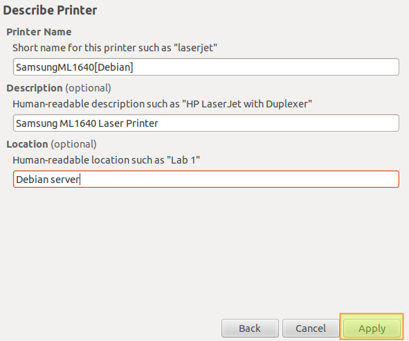 3) 我们将会被要求填写一些关于我们打印机的信息。当我们输入完成时,将点击 "Apply"按钮。