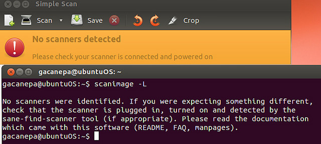 1)让我们第一步来检查在我们的Ubuntu客户端主机上是否存在一台可用的扫描仪。没有先前的安装,你将会看到信息提示"没有识别到扫描仪." $ scanimage -L