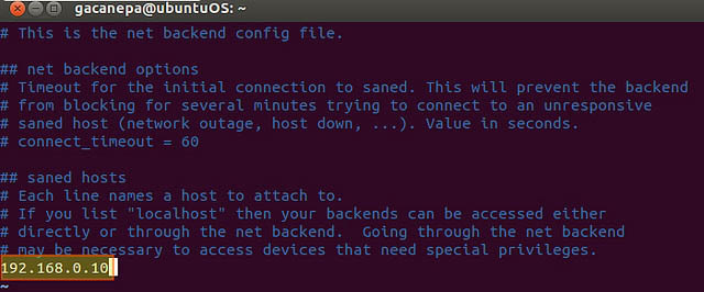 3) 让我们编辑/etc/sane.d/net.conf文件,并在扫描仪安装后添加服务器IP地址:
