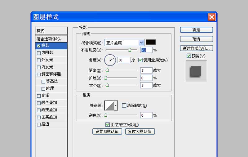 5、双击图层1调出图层样式对话框,勾选投影选项,采用默认参数即可。