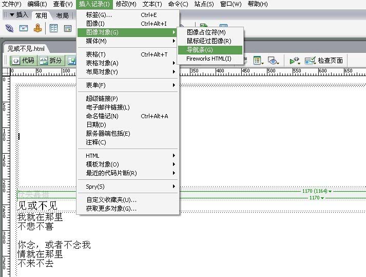 3、把鼠标光标放在需要插入导航条的地方,选择插入记录-图像对象-导航条命令。
