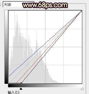 4、按Ctrl + Alt + 2 调出高光选区,按Ctrl + Shift + I 反选得到暗部选区,然后创建曲线调整图层,对RGB、红、蓝通道进行调整,参数设置如图10,确定后用透明度较低黑色画笔把树林部分擦出来,效果如图11。这一步主要把草地部分大幅压暗。