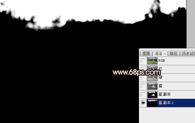8、把背景图层复制一层,按Ctrl + Shift + ] 置顶。进入通道面板,把蓝色通道复制一份,得到蓝副本通道。按Ctrl + L 对蓝副本通道调整色阶,增加明暗对比,把天空部分调成白色,其它区域调暗,如下图。