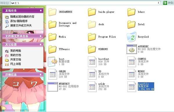 pagefile.sys即安装过程中创建的虚拟内存页面文件。这个文件的大小是自己系统虚拟内存设置的最小值的大小。假如虚拟内存的设置为 800MB-1600MB 那么你在自己的设定驱动盘下面就可看到大小为800MB的pagefile.sys文件这个文件不能删除,不过我们可以改变其大小和存放位置:右击“我的 电脑/属性”,然后在对话框的“高级”标签下单击“性能”下的“设置”按钮,在”性能选项”对话框中切换到“高级”标签下,再单击“虚拟内存”下的“更 改”按钮,即可根据需要更改页面文件的大小——先选中C盘,然后选“无分页文件”,再点“设置”按钮;之后选中要生成该文件的盘符,在下面点选“自定义大 小”并输入合适的数值,此数值通常为物理内存的1.5倍,再单击“设置”,最后确定,重新启动电脑,该文件就在其他分区上了。我不推荐禁用虚拟内存,即使 你的物理内存有2G,会出现一些兼容性问题。