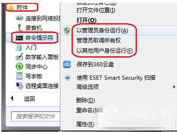 7、而对于有权限限制的用户,则应该在“开始”的“附件”下,右击“命令提示符”命令,从弹出的菜单列表中选择“以管理员身份运行”或“以其他用户身份运行”(XP中是“运行方式。。。”命令):