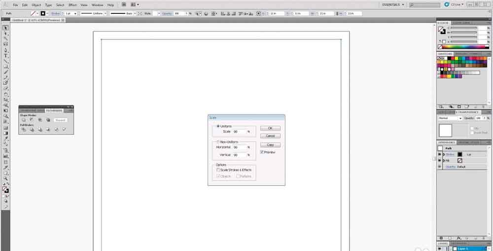2、这个中心广场上的文档,并同时选择它,弹出缩放对话框(对象>变换>缩放)。从这个输入98%,然后选择复制。然后,这将在98%的它的大小创建平方的中心副本。选择再次变换功能,第二方(命令/按Ctrl + D)重复这一点。按住这些键重复此之前,正视很暗的中心。放大并删除有重叠边界的任何方块。