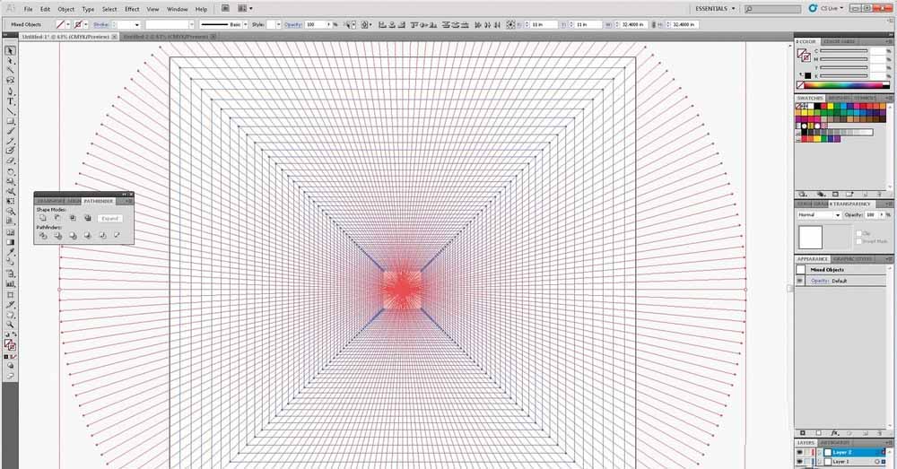 5、确保两个层中的所有内容都集中在文件中,并从第二层中的线路中的全部文件的边缘的外侧重叠。打全选(命令/按Ctrl + A所有对象),并确保线条和填充属性是透明的。