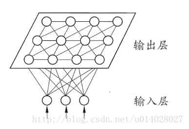 - 网络结构:输入层和输出层(或竞争层),如下图所示。