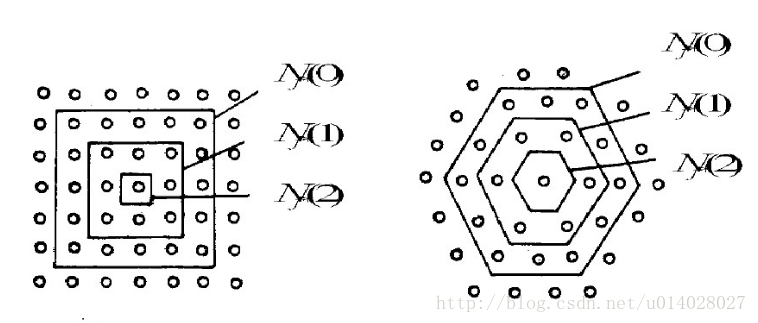 4.更新学习速率η及拓扑邻域N,N随时间增大距离变小,如下图所示。