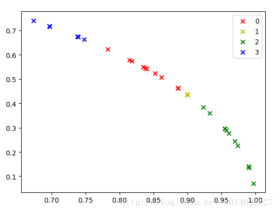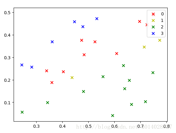 pl.scatter(coo_X, coo_Y, marker='x', color=colValue[i%len(colValue)], label=i)