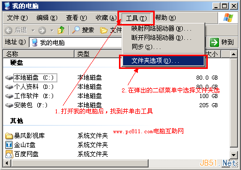 XP设置显示文件扩展名第1步:双击打开桌面上我的电脑,单击工具栏上的工具,在二级菜单中单击“文件夹选项”。