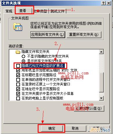 第2步:在打开的文件夹选项窗口中单击“查看”选项卡,在高级设置文本框把“隐藏已知文件类型的扩展名”前面复选框的勾去掉并单击确定按扭。
