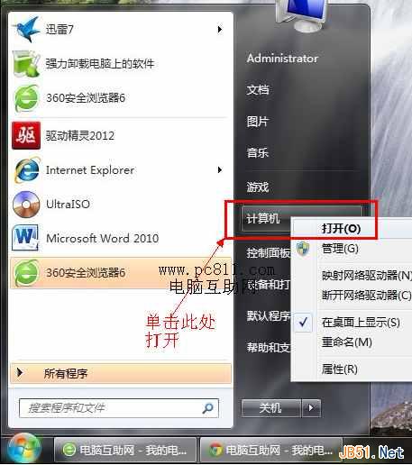 第1步:单击桌面左下角的开始按扭,在弹出的开始菜单中找到并单击“计算机”。