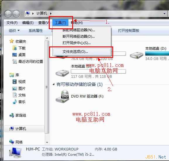 电脑互助网注:这是一般比较常用的打开方法,另外,可以单击开始菜单中的控制面板,在控制面板中找到并双击“文件夹选项”是一样可以打开的。