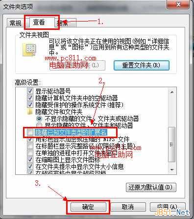 第3步:在打开的文件夹选项窗口中单击“查看”选项卡,并在高级设置下找到“隐藏已知文件类型的扩展名”前面的勾去掉并确定即可。
