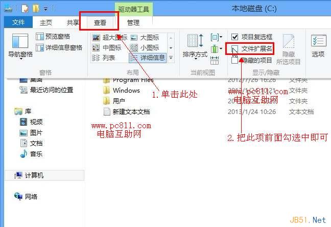 第2步:单击Windows8系统工具栏上的查看,在出现的二级菜单中找到并把“文件扩展名”前面的复选框勾选中即可。