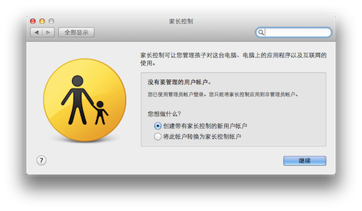在“系统偏好设置”中打开“家长控制”设置。实际上,所谓的“家长控制”其实就是新建一个可以自定义诸多限制选项的用户账户。你可以选择使用简单版的系统界面,系统里的每一个应用都可以单独选择是否允许儿童/访客进行使用。