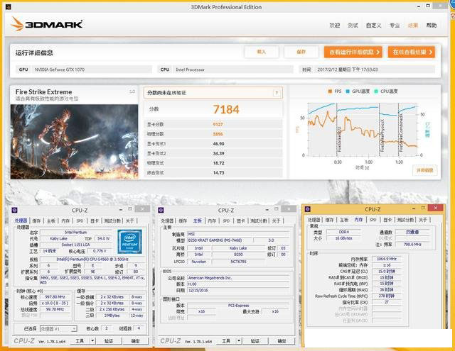 奔腾G4560搭配GTX1070的3DMARK成绩: