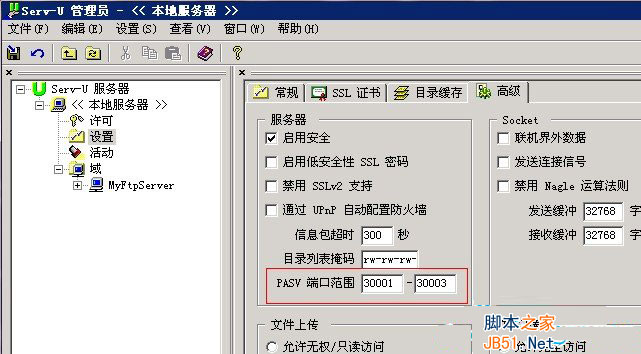 一、在 Serv-U的本地服务器 > 设置 > 高级 > PASV 端口范围里,填入给PASV模式使用的本地端口范围,如 30001-30003 必须要大于1024,最好把端口范围限制在3个以内,比较安全。