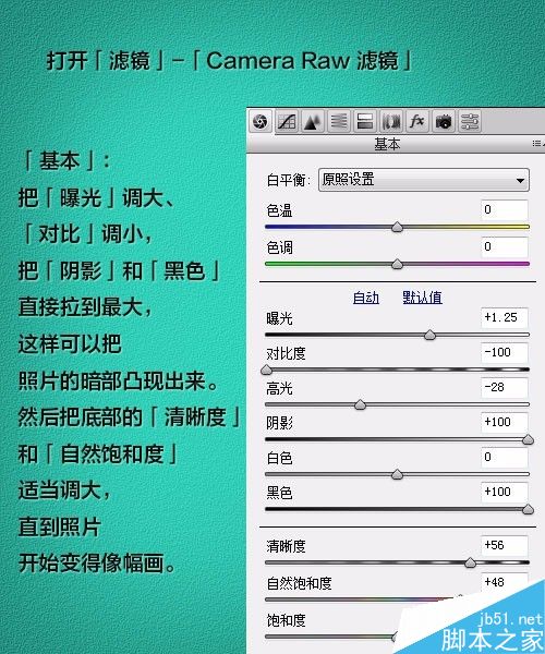Camera Raw 滤镜里只要记得把阴影和黑色拉最大,锐化最大,其余的都看图调。