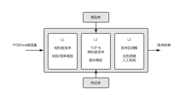 对L1排序结果的前N个进行细粒度排序。这一层会从特征库加载特征(通过FeatureLoader),应用模型(A/B测试配置分配)进行排序。