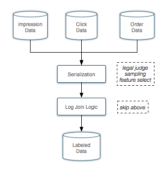 数据序列化之后在HDFS上保存三份文本文件,分别是曝光(Impression)、点击(Click)和下单(Order)。数据标注模块根据globalid(一次搜索的全局唯一标示,类似于sessionid)和相应的团购id为key,将曝光、点击和下单关联起来,最终生成一份标注好是否被点击、下单、支付的标注数据。同时这份标注数据携带了本次展现的详细特征信息。
