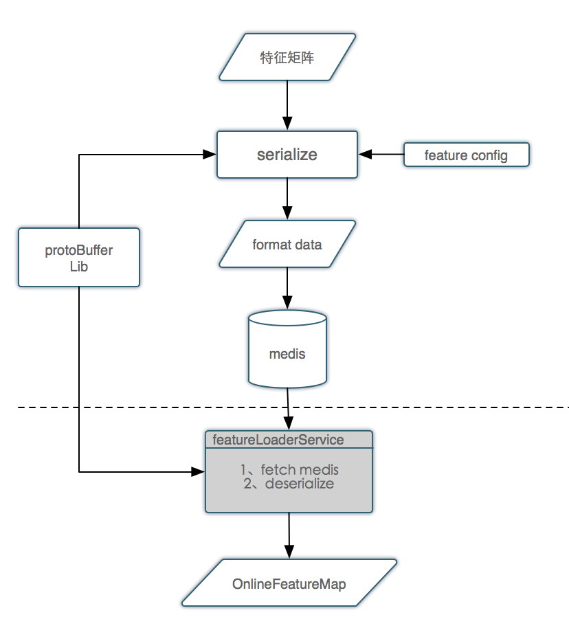 序列化模块通过特征配置文件从特征矩阵抽取需要的特征,调用protoBuffer Lib将特征封装成protoBuffer的格式,写入Medis。