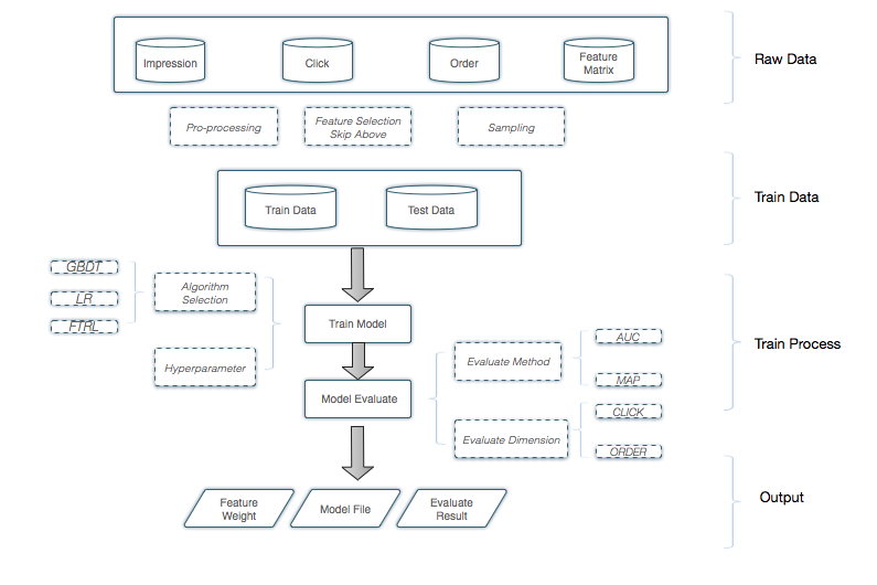 底层是多种模型的实现,算法之前相互独立,每种算法封装成独立的jar,提供给模型训练框架使用,目前支持的算法包括GBDT[4]、FTRL[5]。
