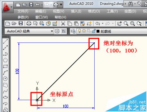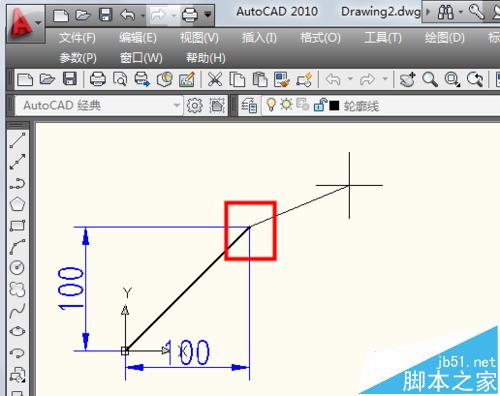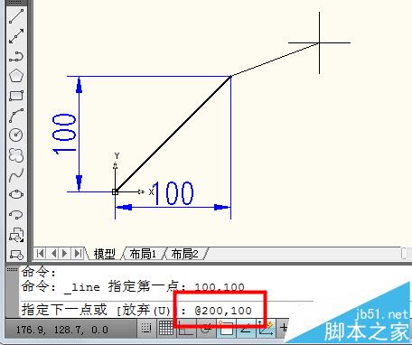 3、相对坐标还有一种画角度的方法,如果输入"@100<45"。
