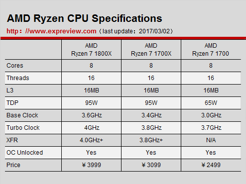 首批上市的锐龙 AMD Ryzen 7处理器是三款八核,具体规格如上表所示,主要还算频率上的区别,然而这三款处理器都是不锁倍频的,有经验的老玩家应该一眼就看得出锐龙 AMD Ryzen 7 1700的性价比与可玩性是最高的,对于一颗不锁频的CPU来说默认频率就是浮云,打算买锐龙 AMD Ryzen 7 1700回来超到4GHz来用的人绝对不在少数,现在我们就要测试一下这款超高性价比的八核处理器。