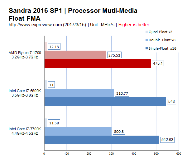 Sandra 2016 SP1处理器多媒体单精度、双精度、四精度浮点测试,使用FMA指令集,Ryzen 7 1700在四精度浮点运算上占一些优势,单精度与双精度都处于下风。
