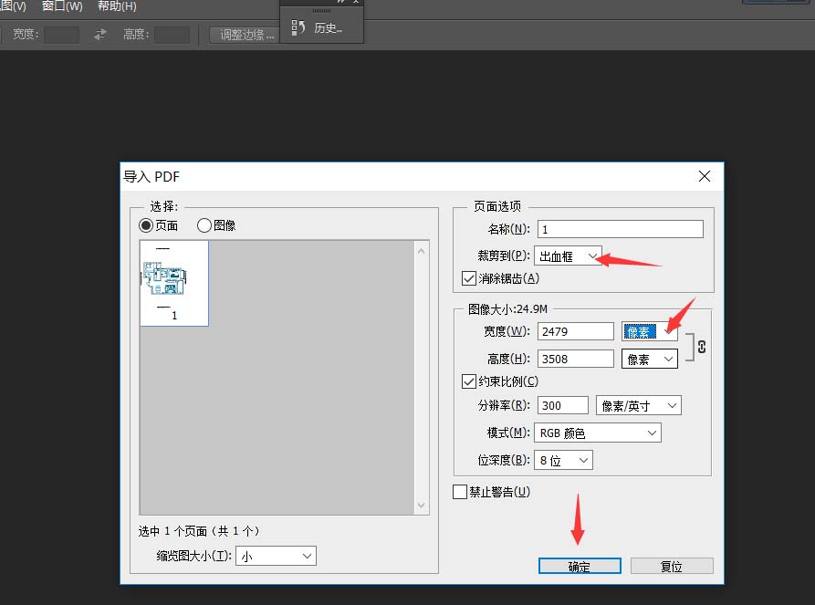 2、将保存的PDF文件用Photoshop打开,剪裁到“出血框”,宽度和高度“像素”,单击“确定”,导入打开之后如下图。