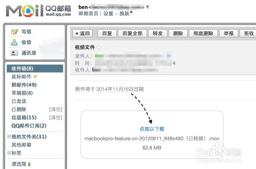 3、接下来当对方收到邮件以后,邮件中并不会包含我们之前发送的大容量附件。在邮件中可会提示我们点击来下载附件,并且还可以看到此附件将在什么时间过期。
