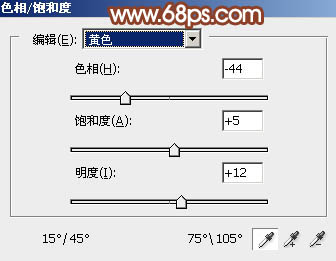 1、打开素材图片,创建色相/饱和度调整图层,对黄、绿,青进行调整,参数设置如图1 - 3,效果如图4。这一步快速把图片中的黄绿色转为橙红色。