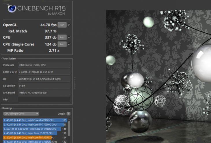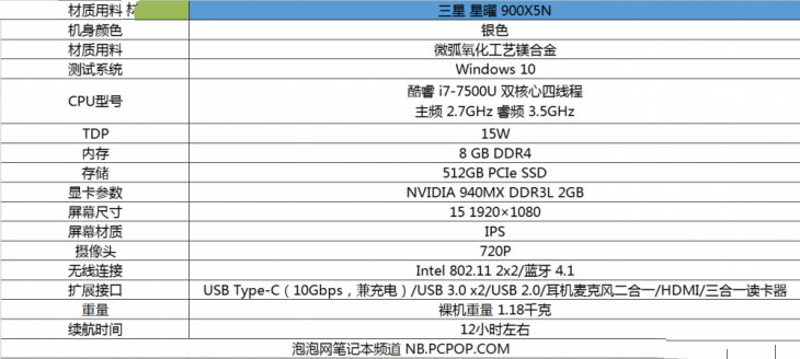 Intel Core i7-7500U是基于Kaby Lake架构的,采用14nm制造工艺的双核心四线程处理器,具有2.7GHz的默认主频,并且能够睿频到3.5GHz。三星星曜900X5N使用的这颗i7-7500U在《CineBench R15》测试环节中取得了多核心337cb、单核心124cb的好成绩,出色的性能能够轻松满足用户的日常使用。