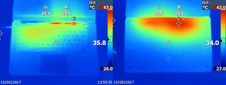 通过热力图我们能够看出,三星星曜900X5N在满负荷工作状态下,正面45.9℃的最高温度出现在了出风口的右侧,背面的最高温度为42.6℃,主要分布在机身进风口处。用户在日常使用中,手掌和手腕部分是几乎很难感受到笔记本带来的热量的,而且最高45.9摄氏度的监测温度说明星曜900X5N的散热性能足够优秀了。