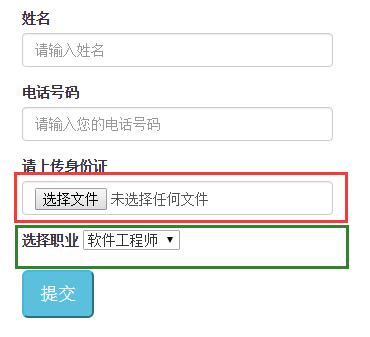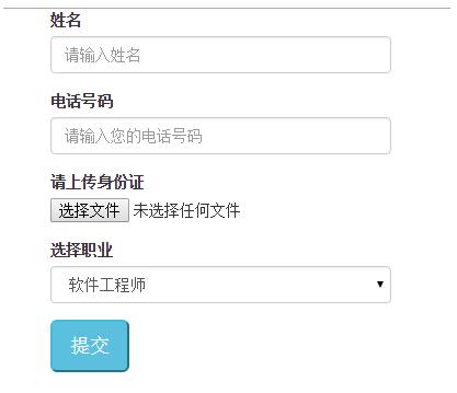 <body style="padding: 20px;"> <form role = "form" class="form-horizontal"> <div class = "form-group"> <label class="col-sm-2 control-label" for = "name">姓名</label> <div class="col-sm-2"> <input type = "text" class = "form-control" id = "name" placeholder = "请输入姓名"></input> </div> </div> <div class = "form-group"> <label class="col-sm-2 control-label" for = "tel">电话号码</label> <div class="col-sm-2"> <input type="text" class="form-control" id = "tel" placeholder = "请输入您的电话号码"></input> </div> </div> <div class = "form-group"> <label class="col-sm-2 control-label" for = "idCard">请上传身份证</label> <div class="col-sm-2"> <input type = "file" id = "idCard" style="display:inline-block;"></input> </div> </div> <div class = "form-group"> <label class="col-sm-2 control-label" for = "profession">选择职业</label> <div class="col-sm-2"> <select id = "profession" class = "form-control"> <option>软件工程师</option> <option>测试工程师</option> <option>硬件工程师</option> <option>质量分析师</option> </select> </div> </div> <div class="form-group"> <div class="col-sm-2 col-sm-offset-2"> <button type = "submit" class="btn-info btn-lg">提交</button> </div> </div> </form> </body>