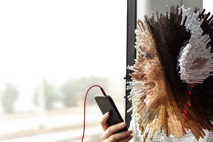 风格诡异的大神John前段时间发了一套有点炫酷又很神经的设计图,所有的脑袋都被分割为一根根立方体飞射而出。达到强烈的3D效果。其实用到的工具很简单,仅仅是滤镜里面的凸出,就达到了这种效果。