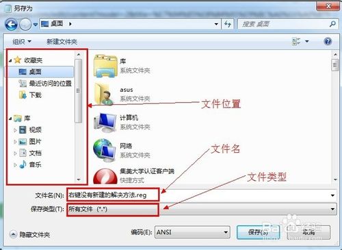 然后点击右上角的“╳”的关闭图标,在弹出的有关是否保存的窗口选择“保存”,然后选择保存位置(我这里选择桌面),文件名填“右键没有新建的解决方法.reg”,文件类型选择“所有文件”,点击“保存”。这时桌面就有我们刚才建的文件
