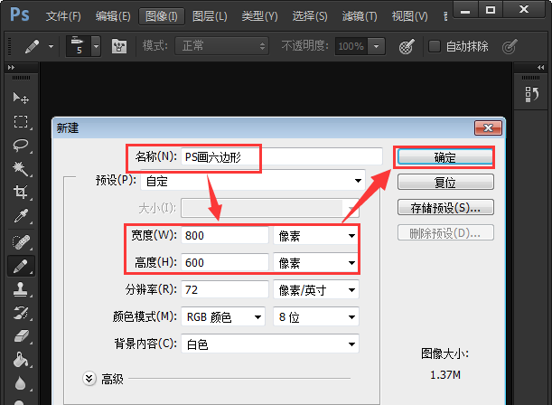 1、打开PS软件,新建一个【高度800*宽度600像素】的白色画布,点击【确定】按钮。